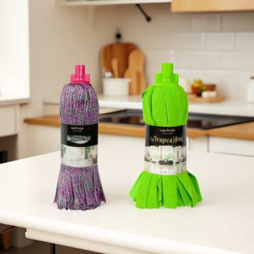 La fregona trapeadora de Laboncler contiene unas cintas de microfibra con medidas y tejidos especiales que abarcan más superficie. y además no pesan nada.